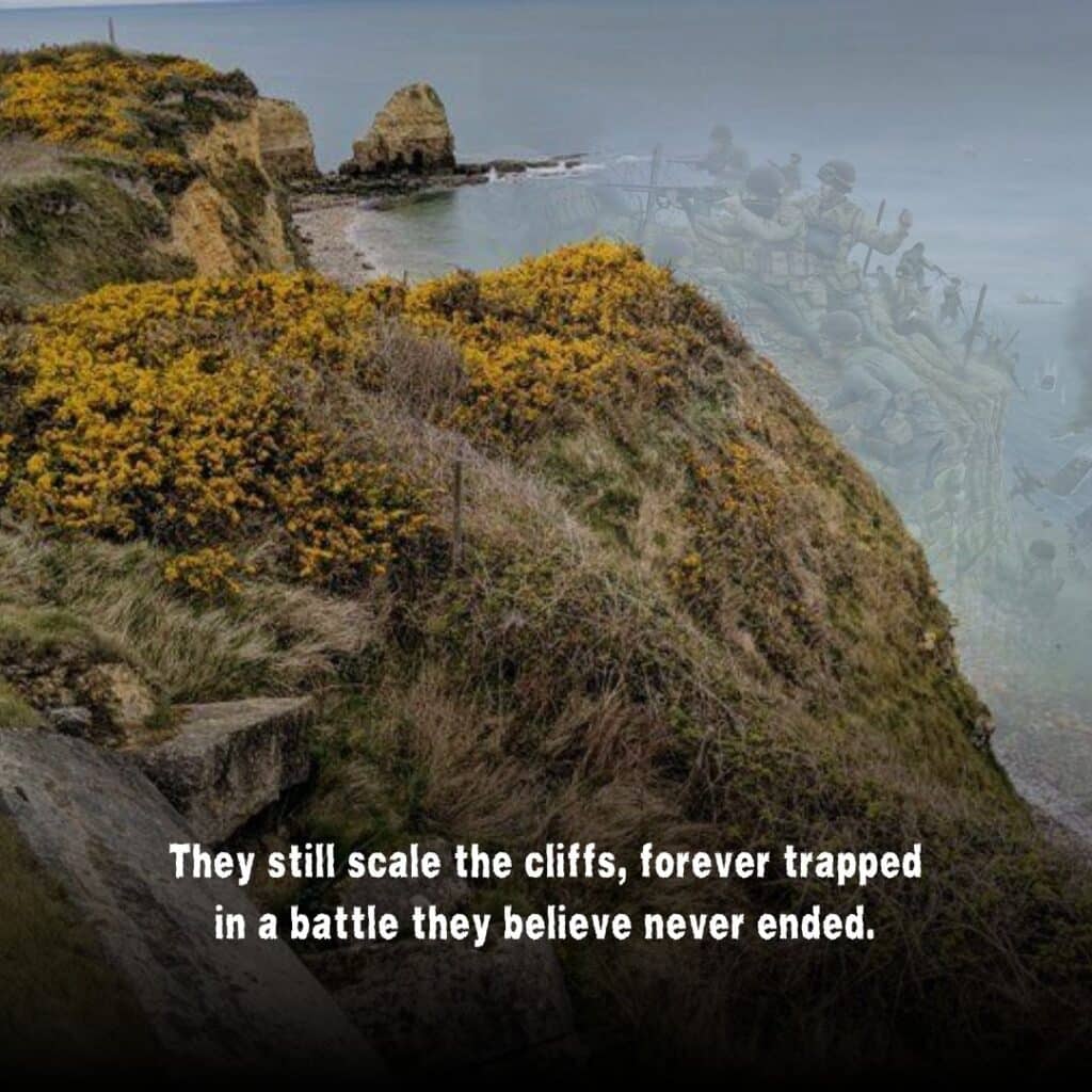 Today, visitors to the preserved bunkers and bombed-out craters often describe an unsettling silence, broken only by whispers of phantom gunfire or shouted orders carried on the wind. Some have claimed to see ghostly soldiers climbing the cliffs once more, bayonets in hand, faces twisted in fear and determination. They appear frozen in the chaos of June 6, 1944, eternally replaying the horrors of that fateful day.