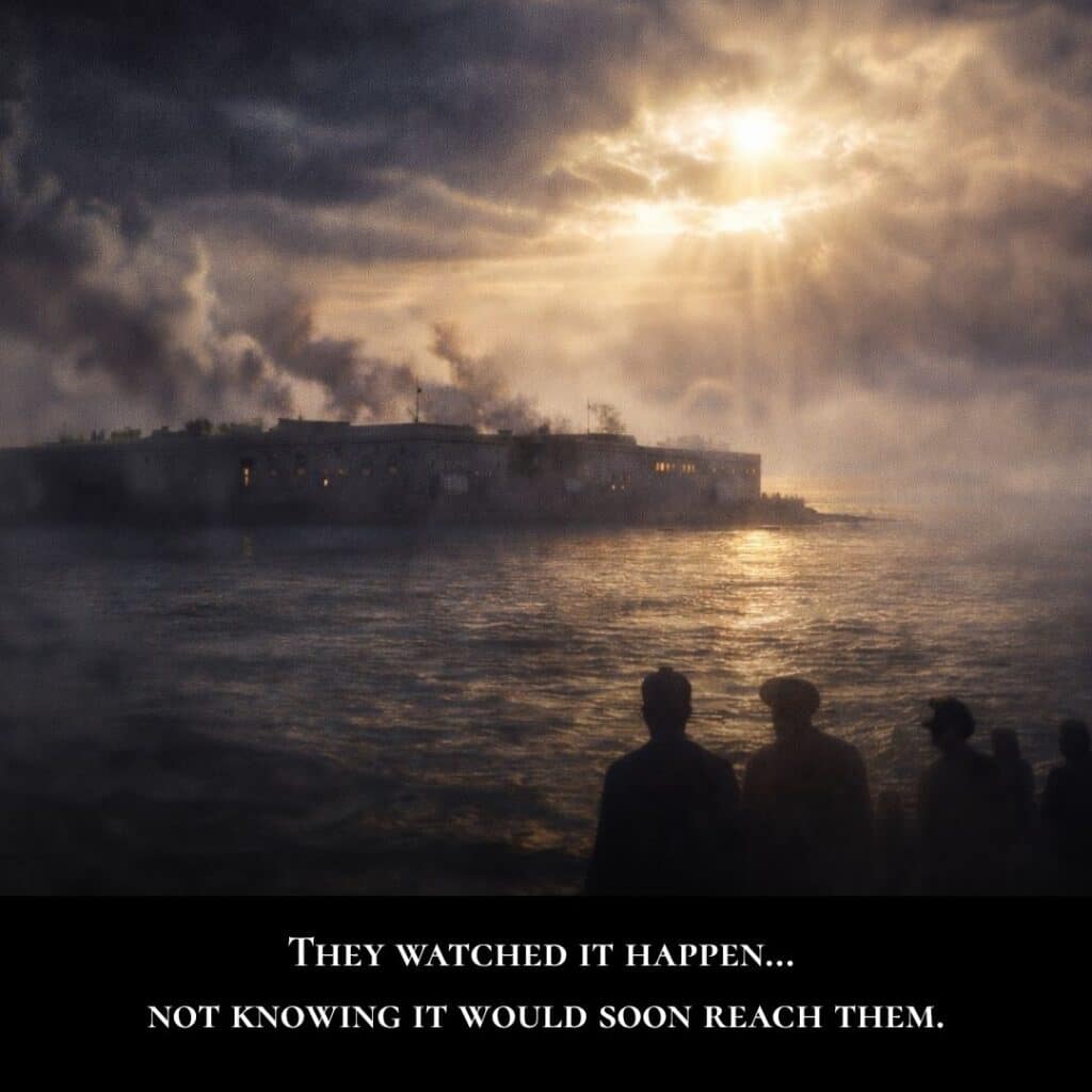 Inside Fort Sumter, men were pulled from sleep into immediate action. Instinct took over as they moved quickly to their positions, not because they fully understood the moment, but because they knew they had to respond. Training and discipline filled the space where certainty could not. Beyond the fort, in Charleston, the sound carried across the water. People woke suddenly. Windows opened. Doors creaked as families stepped outside, drawn by something they could not yet see. Some stood in silence, listening, while others spoke in hushed tones, trying to make sense of what they were hearing. There was no clear explanation, only the echo of cannon fire rolling through the early morning air.